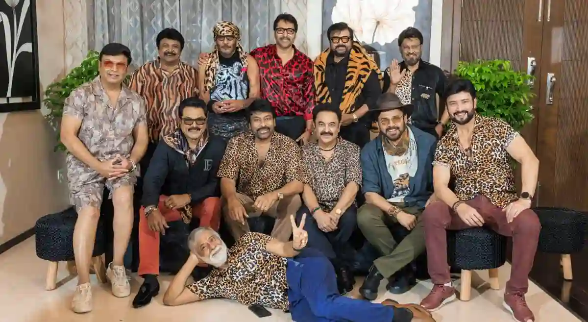 The photographs shared by Chiru feature yesteryear stars like Venkatesh, Sarathkumar, Jackie Shroff, Naresh, Suresh, Prabhu, Jayaram, Suhasini, Ramya Krishna, Jayasudha, Sobhana, Nadiya, Meena, Khushboo, and Radha, among others.