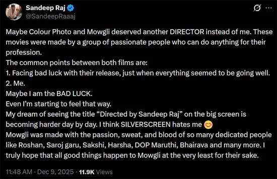 The disappointed filmmaker wrote that both his films, Colour Photo and Mowgli 2025, deserved another director because both releases had faced unexpected roadblocks. He went as far as to say he might be the “bad luck” factor affecting their release plans.