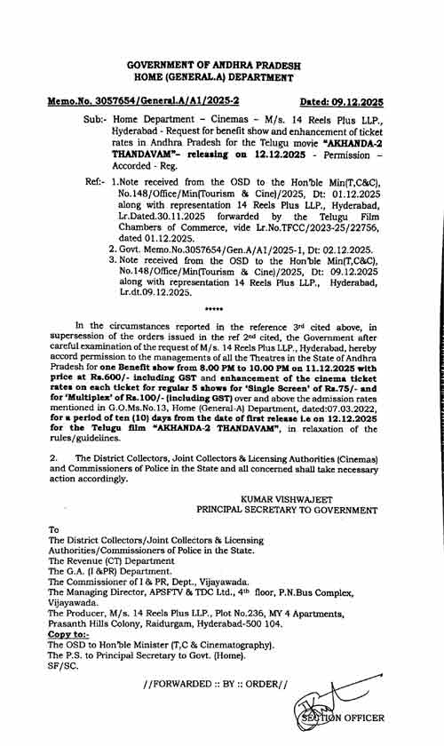 After facing many obstacles, Akhanda 2, headlined by Balakrishna, is finally slated to hit the big screens on December 12, 2025. The announcement came a while ago, and now the AP government has issued a fresh G.O. with enhanced ticket prices.