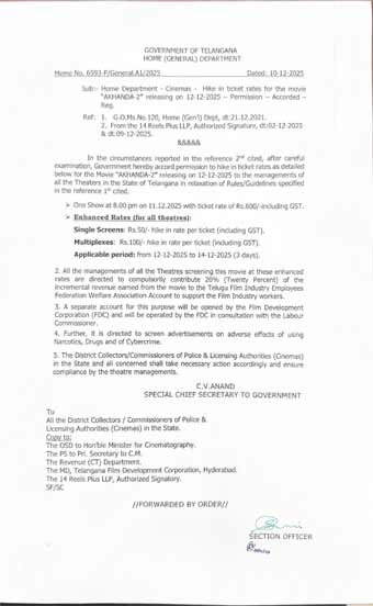 For regular shows, ticket prices have increased by Rs. 50/- (including GST) in single screens and Rs. 100/- (including GST) in multiplexes. With this revision, the new fares are set at Rs. 395/- in multiplexes and Rs. 227/- in single screens. The revised G.O. also makes it clear that the team should give 20% of the incremental revenue to the ‘Telugu Film Industry Employees Federation.’