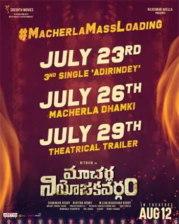 Highly pumped up by the phenomenal response the team is now ready to treat fans with a bunch of updates. The third song Adirindey will be out on July 23. On July 26th a special update titled Macherla Damki will be revealed. On July 29th the theatrical trailer of this action drama will be released by the team.