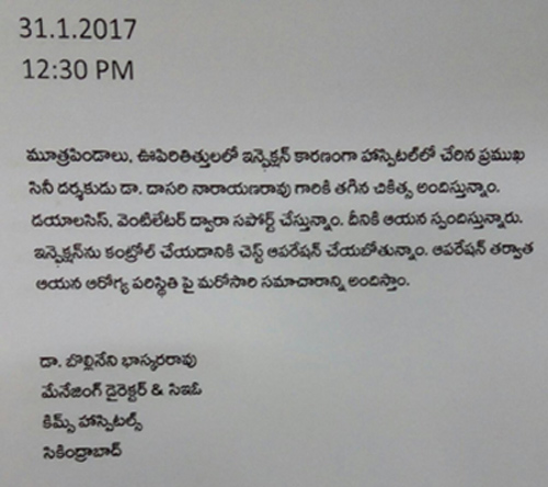 The doctors from KIMS in a fresh report reveal that they are going to operate Dasari very soon. A team of highly qualified doctors is treating the legendary thespian who has been suffering from this problem from the past few years.