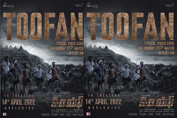 The makers have released a brand new poster to announce the first song titled Toofan. It is also confirmed that the song will be out on March 21, 2022, at 11:07 AM. Composed by Ravi Basrur, the song will be released in Kannada, Telugu, Tamil, Malayalam and Hindi.