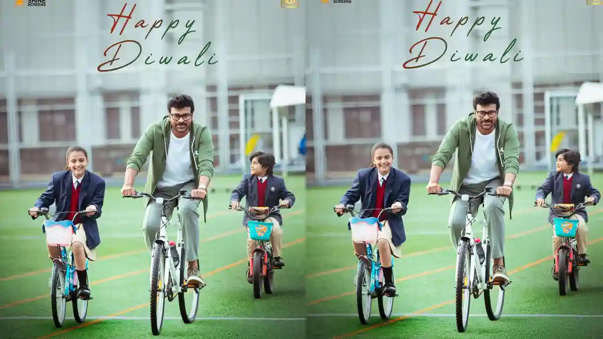 On Diwali, the makers unveiled a new poster showing Chiranjeevi in an ultra-youthful avatar. Sporting a light-green hooded jacket over a white T-shirt with matching trousers, Chiru looks energetic and lively. His signature smile, sleek black mountain bicycle, stylish glasses, and neatly trimmed beard complete the vibrant look. Two cheerful school children riding bicycles alongside him add a perfect family-friendly festive vibe.