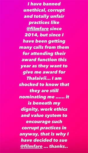 “I made clear to them back in 2013 that I will never attend anything which is morally depraved and unethical. So when they know I won’t attend and as a policy they won’t give awards to those who don’t attend so why nominations?? Making desperate blackmailing calls to attend awards after pitting against mediocre work” she posted.