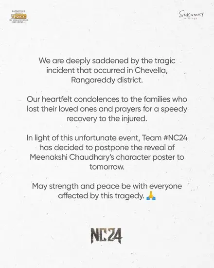 In a note, the makers said they were deeply saddened by what happened, offering their condolences to the families who lost their loved ones and wishing a speedy recovery to the injured. They also shared that the character poster reveal has been moved to tomorrow out of respect for those affected.