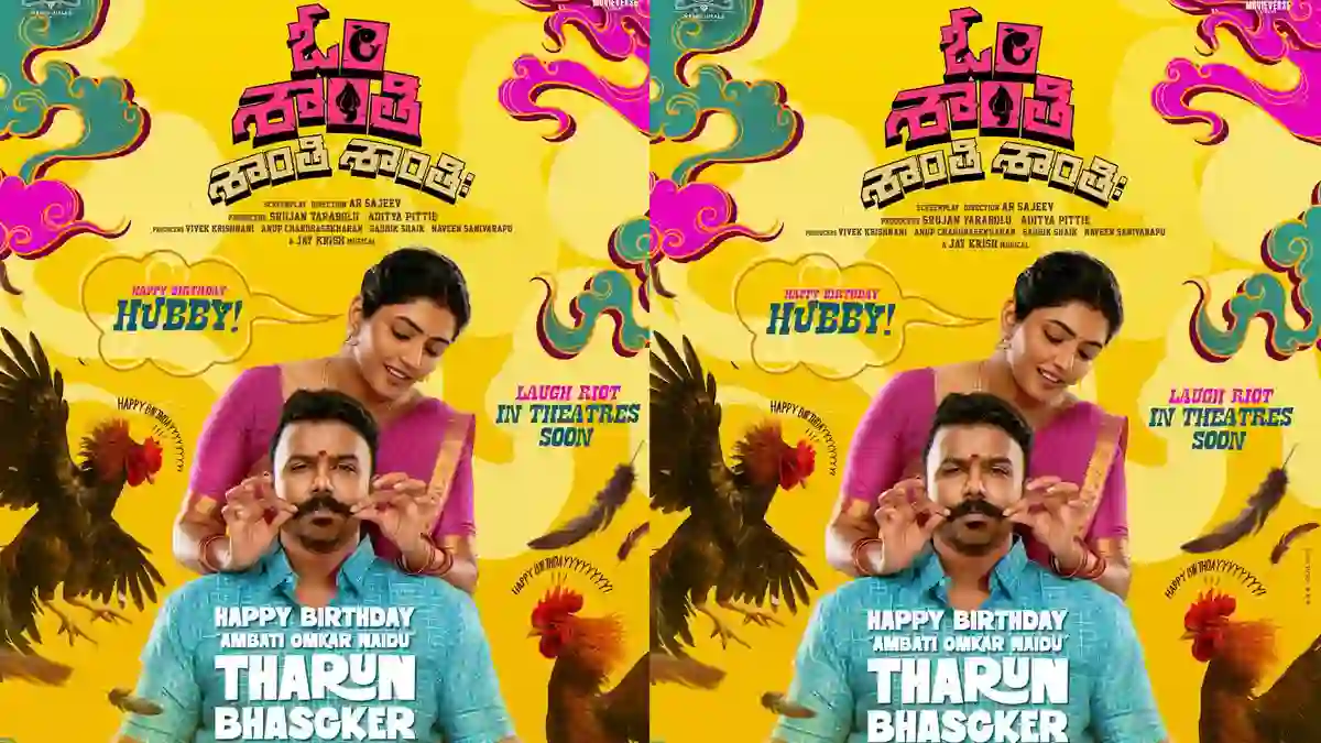 To celebrate Tharun’s birthday, the makers released a fresh poster. Captioned “Happy Birthday to Ambati Omkar Naidu,” it highlights his character from the film. The poster shows Eesha playfully twirling Tharun’s moustache and wishing him, “Happy birthday, hubby.”