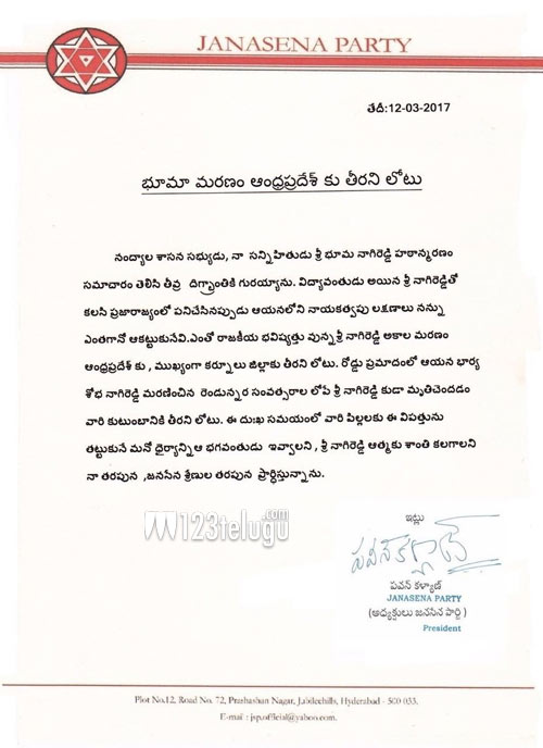 Pawan said that Bhuma’s death is a great loss to AP and Kurnool politics and extended his condolences to his children.