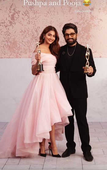Pooja won the best actress award yesterday at the SIIMA awards held in Bangalore. This is the second time in a row the actress bagged the award. She posted a cute moment on her Instagram story today with Icon Star Allu Arjun.