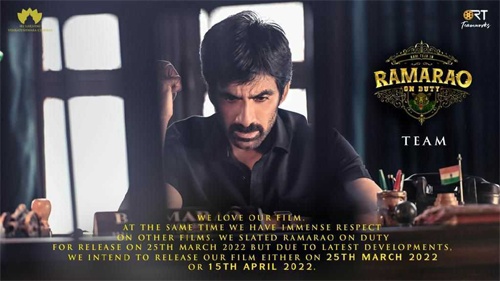 As many Tollywood biggies announced their latest release date, team Ramarao On Duty wanted to make a way for them. So, the makers have announced that the movie might be postponed to April 15, 2022.