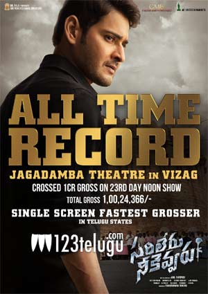 In a latest never before feat, Sarileru Neekevvaru has become the first ever movie to collect Rs 1 crore gross at Vizag’s iconic Jagadamba Theater. Until the noon show on its 23rd day, Sarileru has collected a total gross of Rs 1,00,24,366 at Jagadamba Theater and became the fastest grossing film at any single screen in the twin Telugu states.