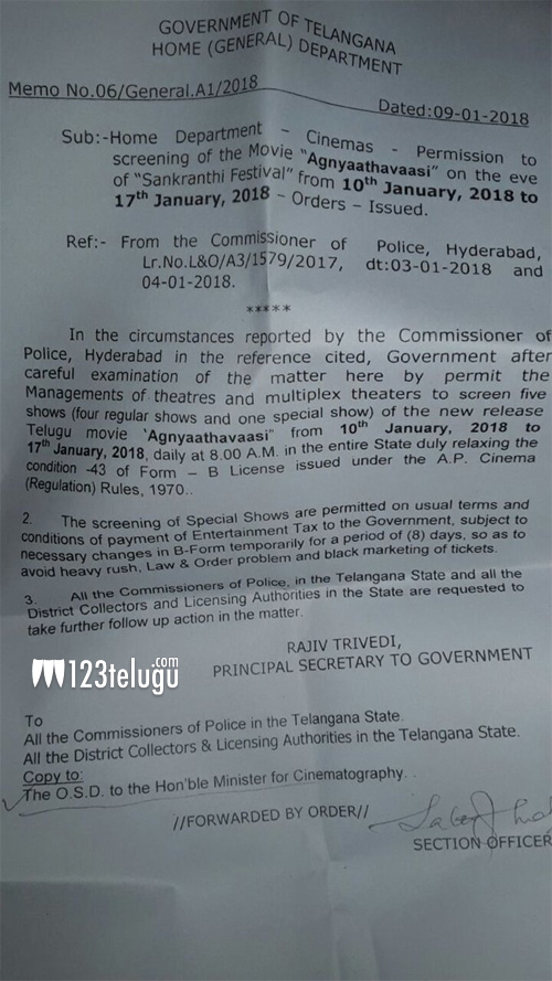 Power Star Pawan Kalyan’s Agnyaathavaasi is all set for a humongous worldwide opening in a few hours. Meanwhile, in what can be seen as a major boost to the film’s box-office prospects across the state, the Telangana government today granted permission for one extra show per day, in addition to the four regular shows. The special show must be screened at 8 am each day from January 10 to 17.