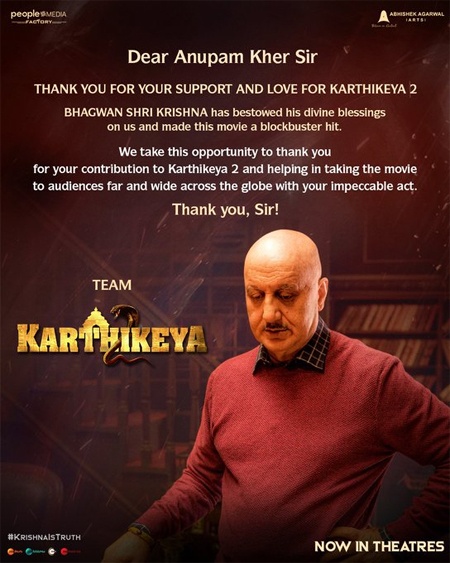 The team has now extended their heartfelt thanks to the veteran actor Anupam Kher who played a key role in the film. Though the screen time of the actor is short, the impact he created by explaining the greatness of Lord Krishna is simply outstanding.