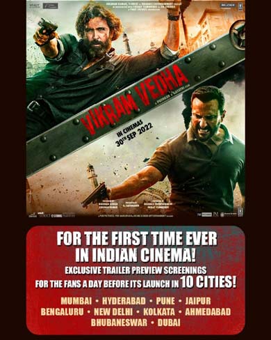 The makers of the movie have come up with a crazy update and they have planned to make fans happy. For the first time ever in the Indian cinema, Vikram Vedha team will screen the theatrical trailer in 10 cities a day before the official launch. It means that the trailer will screen the trailer today in selected PVR multiplexes in Mumbai, Hyderabad, Pune, Jaipur, Bengaluru, New Delhi, Kolkata, Ahmedabad, Bhubaneswar and Dubai.