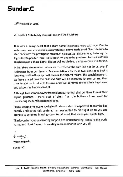 Sundar C didn’t specify the reason for opting out, but he added that his previous associations with Rajini and Kamal will always be cherished by him. He ended the note by apologizing to everyone who waited for the film.