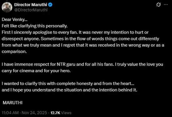 Maruthi has now clarified his intent, and the team hopes the situation settles so that the focus returns to the song and upcoming promotions.