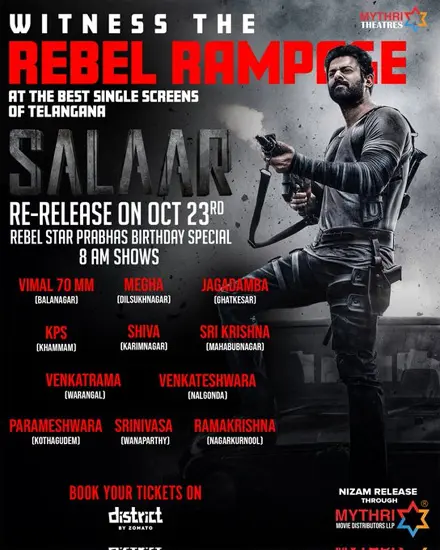 ఇక ఇప్పుడు మరోసారి సింగిల్ స్క్రీన్స్‌ను తగలబెట్టేందుకు సలార్ రెడీ అవుతున్నాడు. అక్టోబర్ 23న తెలంగాణలోని బెస్ట్ సింగిల్ స్క్రీన్స్‌లో ‘సలార్’ స్పెషల్ మార్నింగ్ షోలు వేస్తున్నారు. మరి ఈసారి సలార్ ఎలాంటి సెన్సేషన్ క్రియేట్ చేస్తాడా అనేది ఆసక్తికరంగా మారింది. ఈ సినిమాలో పృథ్వీరాజ్ సుకుమారన్, శ్రియా రెడ్డి, శ్రుతి హాసన్ తదితరులు ఇతర ముఖ్య పాత్రల్లో నటించారు. రవి బస్రూర్ సంగీతం అందించిన ఈ సినిమాను హొంబలే ఫిల్మ్స్ భారీ బడ్జెట్‌తో ప్రొడ్యూస్ చేశారు.