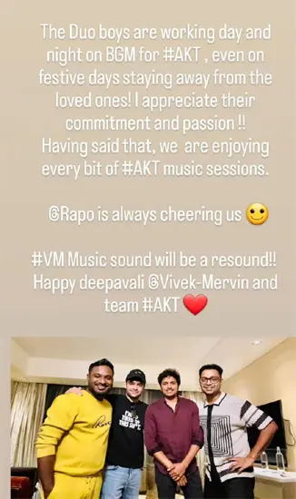 ఇక ఈ సినిమాకు సంబంధించిన పోస్ట్ ప్రొడక్షన్ పనులు ప్రస్తుతం శరవేగంగా జరుగుతున్నాయి. ఈ సినిమాకు వివేక్-మెర్విన్ సంగీతం అందిస్తున్నారు. అయితే, దీపావళి పండుగ నాడు కూడా ఈ చిత్ర బీజీఎం వర్క్‌లో వారు బిజీగా ఉన్నారు. ఈ మేరకు చిత్ర యూనిట్ ఓ ఫోటోను సోషల్ మీడియాలో షేర్ చేసింది.
